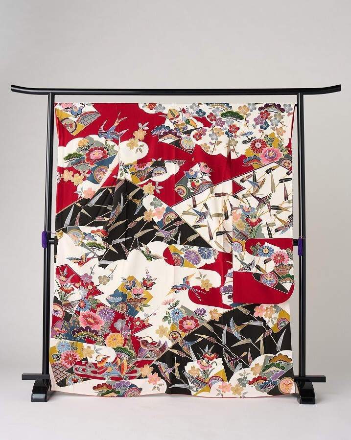 レンタル振袖 正絹【瑞扇花重(ずいせんかがさね)白×赤×黒】※帯・帯締め・帯揚げは季節・年代によってコーディネートさせていただきます。