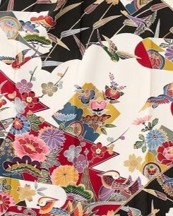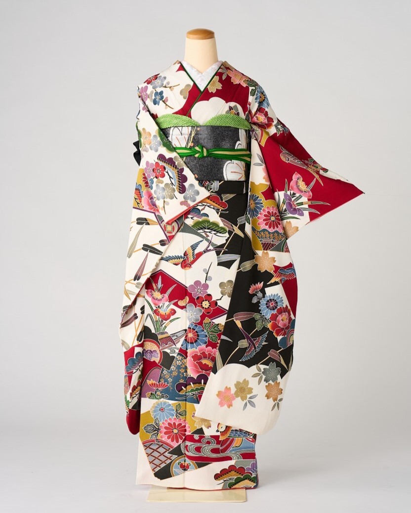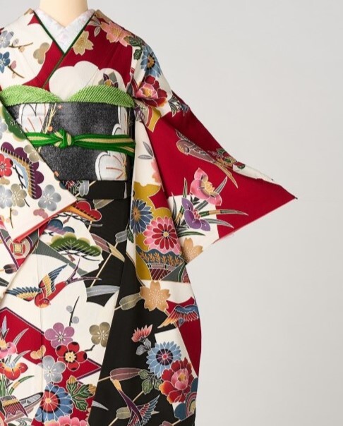 美しいコントラストが華やかに鴛鴦と松竹梅が描かれています。古典日とモダンさを併せ持つ格式ある振袖です。